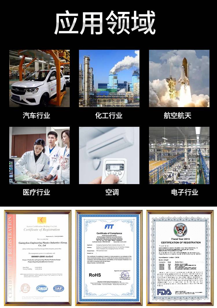 應用航天航空、機械汽車、電子電氣、儀器儀表、醫療衛生、石油化工、軍工核能等高科技工業領域,可制造高要求的機械零部件,現在國內比較成熟的應用有:空壓機的活塞環、止推環、活塞環、密封環、齒輪、星輪、軸承、螺絲、閥片、菌型圈、球閥閥座、軸承保持架、無油潤軸承、磁力泵隔離套等。